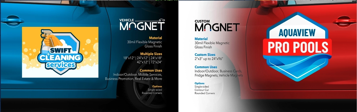 Custom Magnet 30ml Flexible Magnetic, Gloss Finish. Custom Sizes 2″x3″ up to 24″x96″ Indoor/Outdoor Business Cards, Fridge Magnets, Vehicle Magnets & More.